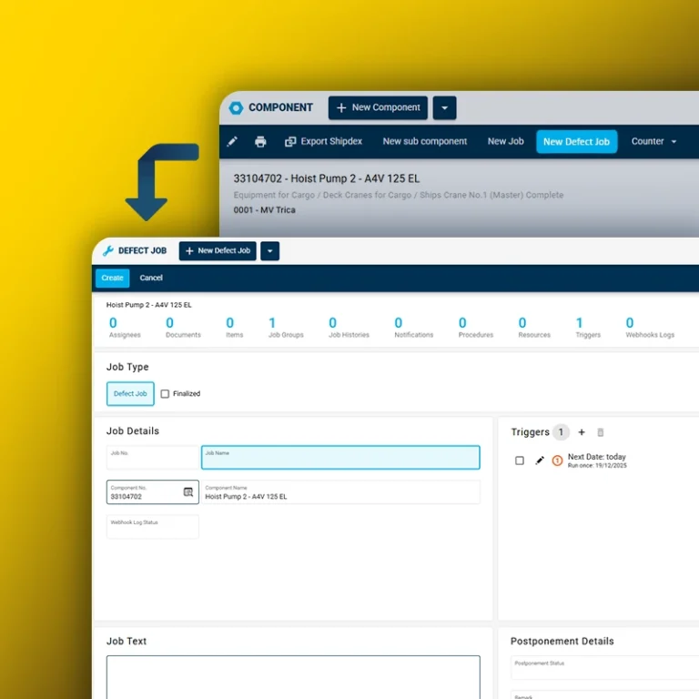 Create a defect job directly from the component screen, automatically linking equipment data. This saves reporting time and ensures the office receives the correct technical context.